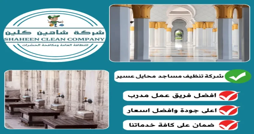 هل تبحث عن شركة تنظيف مساجد بمحايل عسير تضمن نظافة تليق ببيت الله وتُحافظ على راحة المصلين طوال اليوم؟ شاهين كلين تقدم حلول تنظيف وتعقيم شاملة للسجاد ودورات المياه وأماكن الوضوء والأسطح كثيرة اللمس بمواد آمنة وخطط دقيقة تُراعي أوقات الصلاة وخصوصية المكان. اتصل الآن 0535673077 واحجز زيارة تنظيف للمسجد في محايل عسير لتبقى أجواء